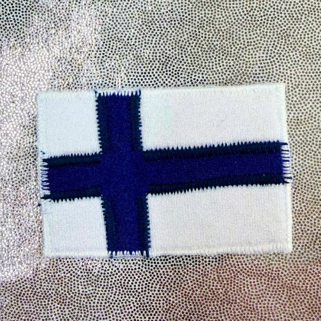 Ommeltava Suomen lippu kiinnitettäväksi kisaasuihin. Valmistettu Suomessa.