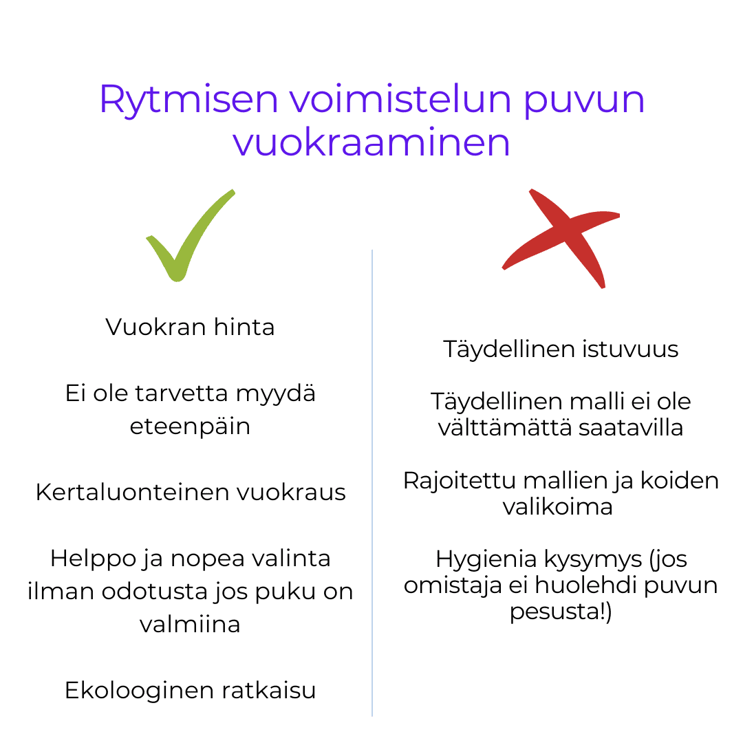 Tarkistettiin puvun vuokraamisen positiiviset puolet ja nyt siirretään negatiivisiin puoliin. Voi olla vaikea löydä täydellisesti istuva puku vuokraamiselle, koska yleensä kisapuvut tehdään mittojen mukaan asiakkaalle, joka vuokraa puvun ensimmäisenä. Kaikki seuraavat asiakkaat valitsevat puvun, joka sopii heille parhaillaan olemassa olevista puvuista. Tämä ongelma on ratkaistava, jos valikoimassa on eri kokoisia pukuja vuokraamiseen. Myös voi olla vaikea löytää kisapuku, joka sopisi ohjelmaan täydellisesti. Vuokrattava puku ei välttämättä ole miellyttävää voimistelijalle, eikä ole hänen ”ainut unelmapukunsa”. Tässä tapauksessa oman puvun luominen on paras ratkaisu. Uuden puvunkin voi tilata omien mittojen mukaan ja vuokrata sovittaessa ompelimon kanssa tästä etukäteen. Tämä palvelu ei ole vielä niin yleistynyt ja hinta voi ylittää jo olemassa olevan puvun vuokrahinnan, mutta se ei ylitä uuden puvun ostoshinnan.