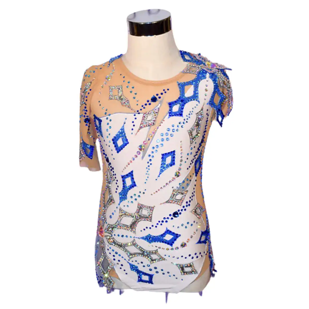Tämä upea rytmisen voimistelun kisapuku yhdistää elegantin designin ja huippulaadukkaat materiaalit, mikä tekee siitä täydellisen valinnan nuorelle voimistelijalle.