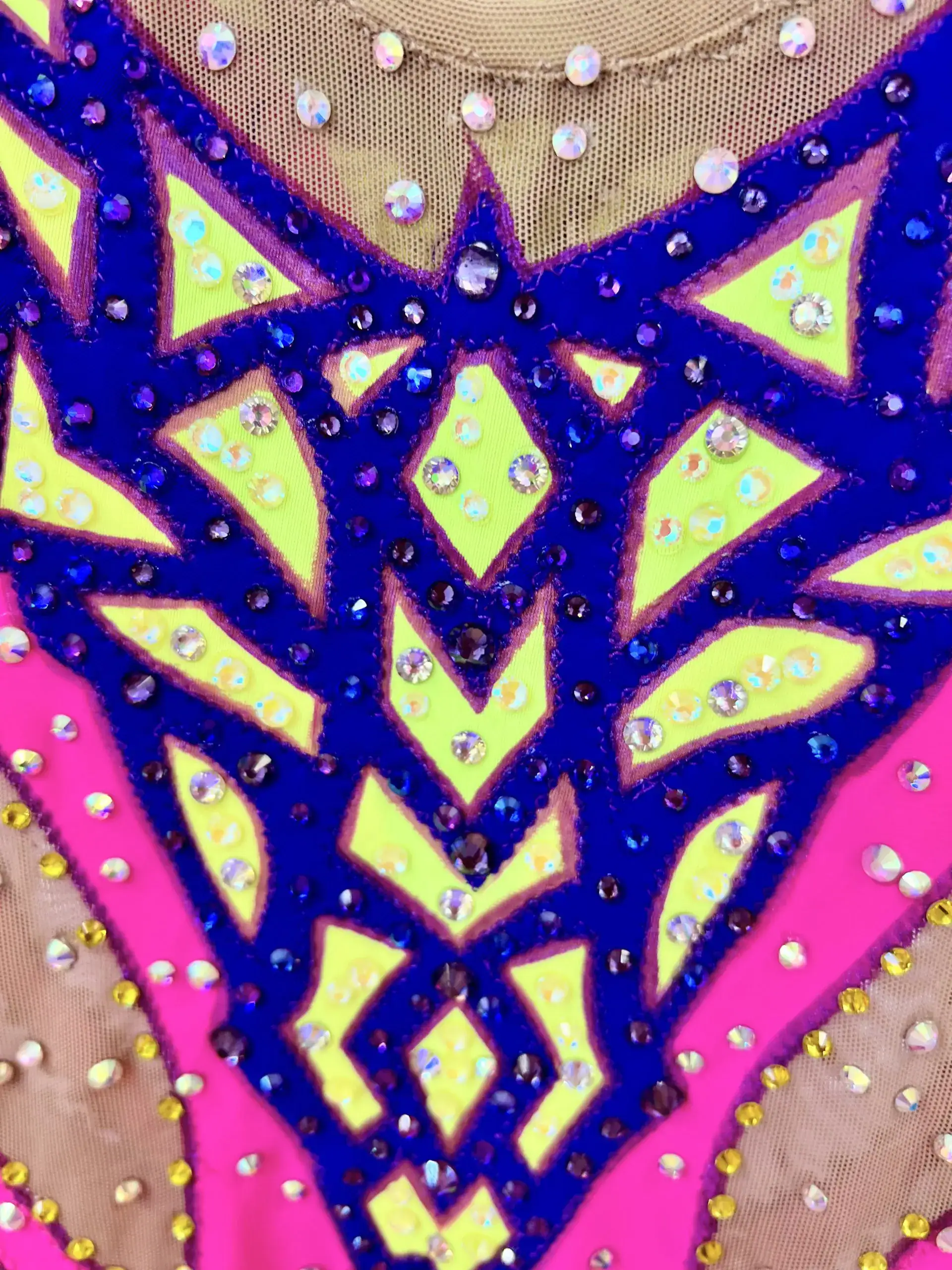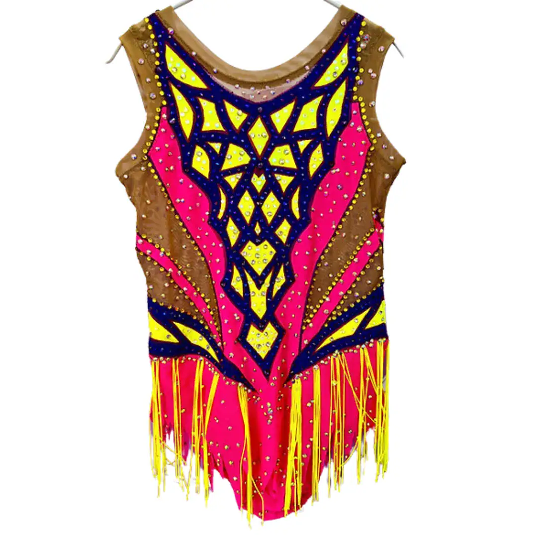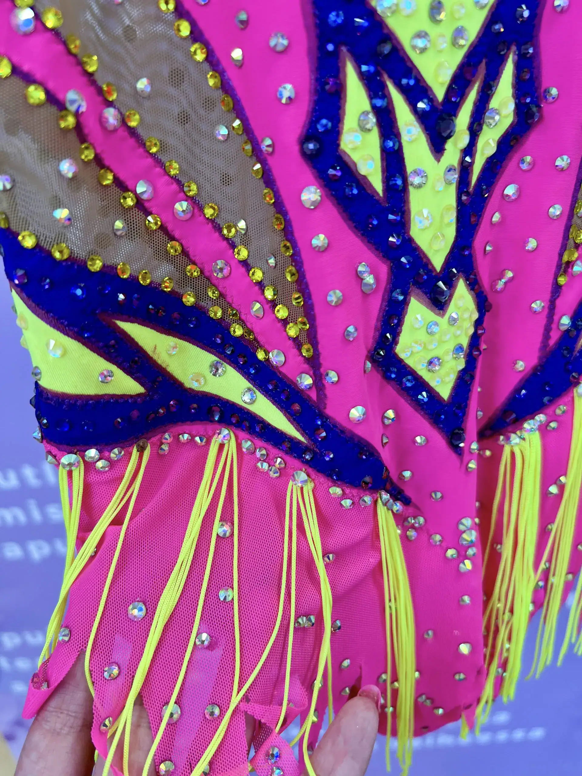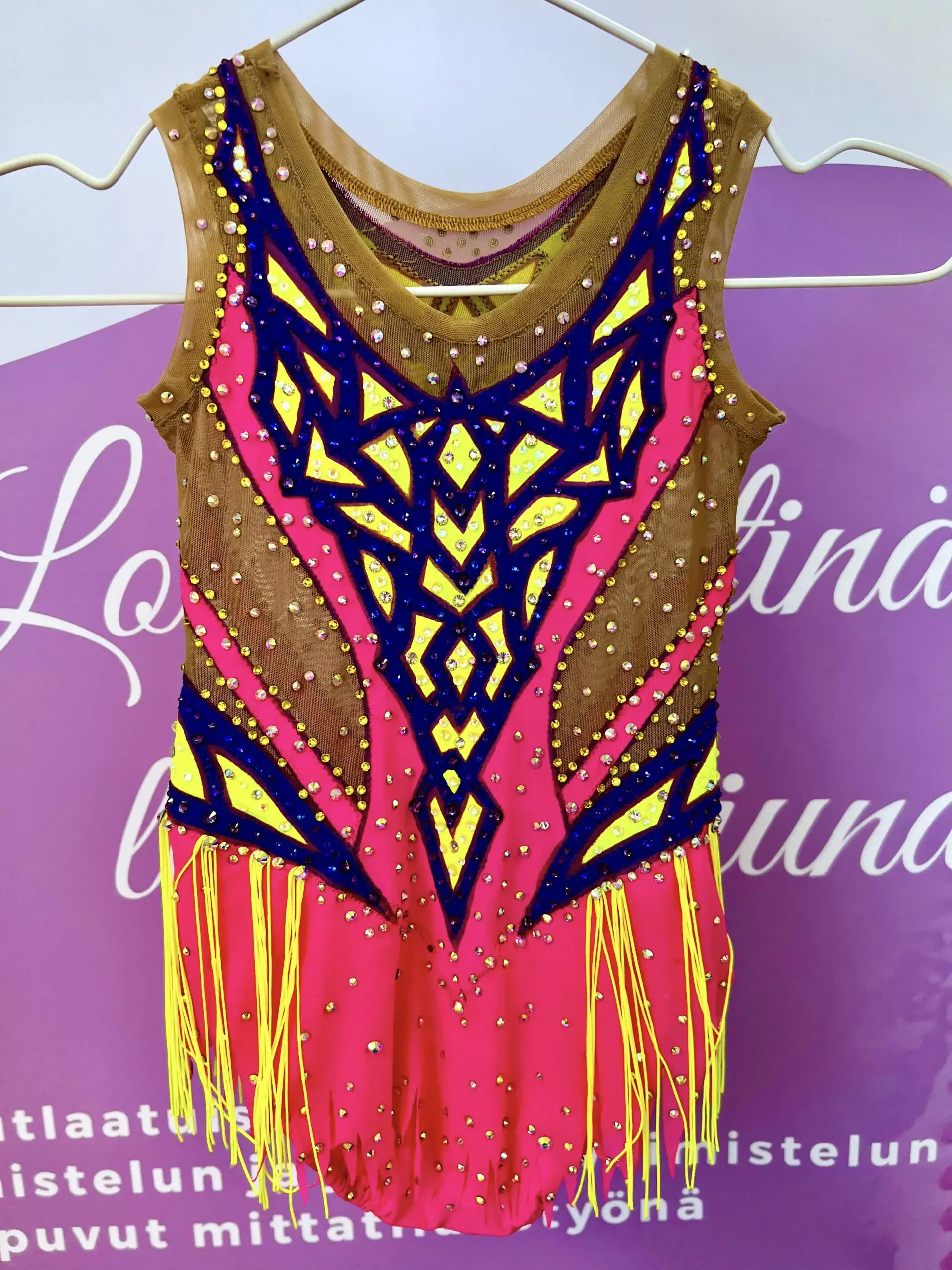 Tämä käytetty Altessa rytmisen voimistelun kisapuku on täydellinen valinta nuorelle voimistelijalle, joka haluaa loistaa esiintymisissä ja kilpailuissa. Puku on erinomaisessa kunnossa ja koristeltu runsailla korkealaatuisilla strasseilla, jotka lisäävät säihkettä ja korostavat liikkeiden kauneutta.